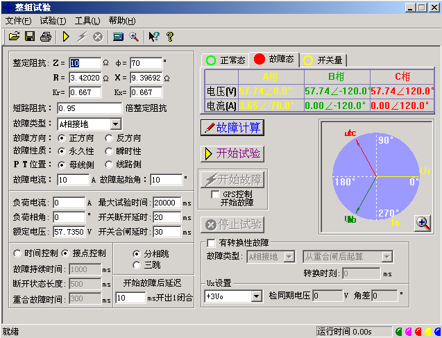 微機繼電保護測試儀整組試驗相當于繼電保護裝置的靜模試驗,通過設(shè)置各試驗參數(shù),模擬各種瞬時、永久性的單相接地、相間短路或轉(zhuǎn)換性故障,以達到對距離、零序保護裝置以及重合閘的動作進行整組試驗或定值校驗。下面以“整組試驗Ⅰ”為例,簡要說明其使用方法。軟件界面如圖。