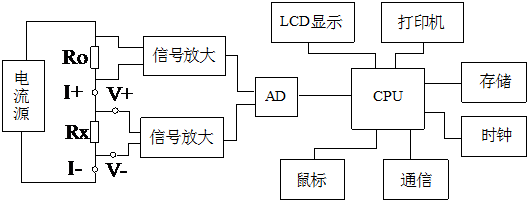 電流源的輸出恒流流過(guò)標(biāo)準(zhǔn)電阻R0和待測(cè)電阻Rx。采樣標(biāo)準(zhǔn)電阻R0上的電壓信號(hào)U0經(jīng)濾波放大后,送入ad轉(zhuǎn)換,計(jì)算出電流值I,如式(1)所示。類似地,待測(cè)電阻Rx上的電壓信號(hào)UX經(jīng)濾波和多級(jí)放大處理后被采樣并發(fā)送到ad以轉(zhuǎn)換為數(shù)字量。電阻值Rx由公式(2)計(jì)算。