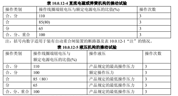直流電磁或彈簧機構的操動試驗,應按表 10.0.12-4 的規定進行;液壓機構的操動試驗,應按表 10.0.12-5 的規定進行。