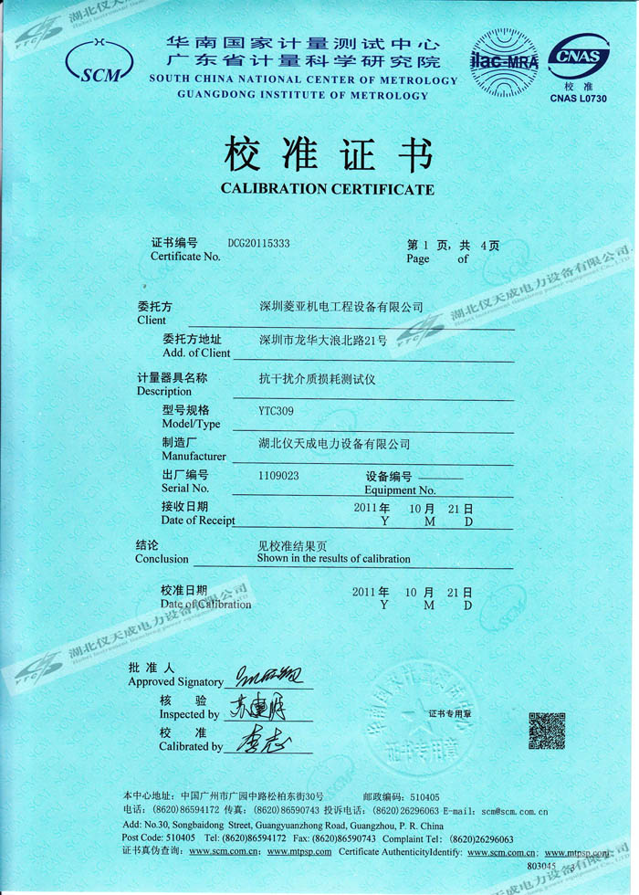 轉載:"YTC309抗干擾介質損耗測試儀的資質證書" 請注明來源于儀天成電力。 更多技術問題請致電儀天成電力客戶服務:027-87876585,技術部專線:027-87876585,在線客服:719388481